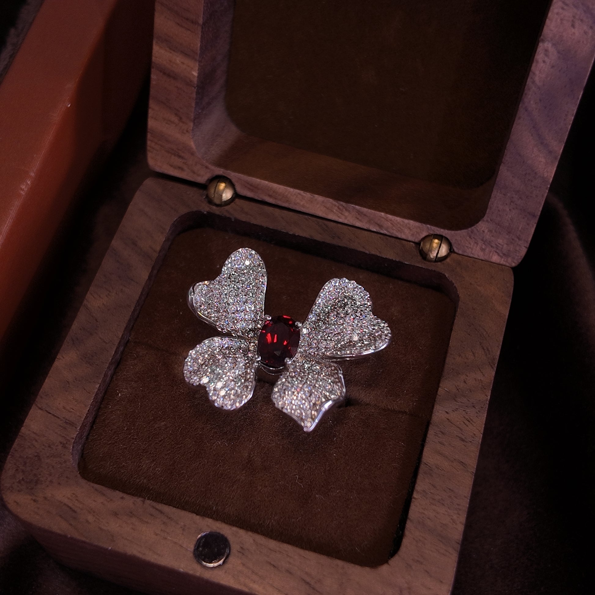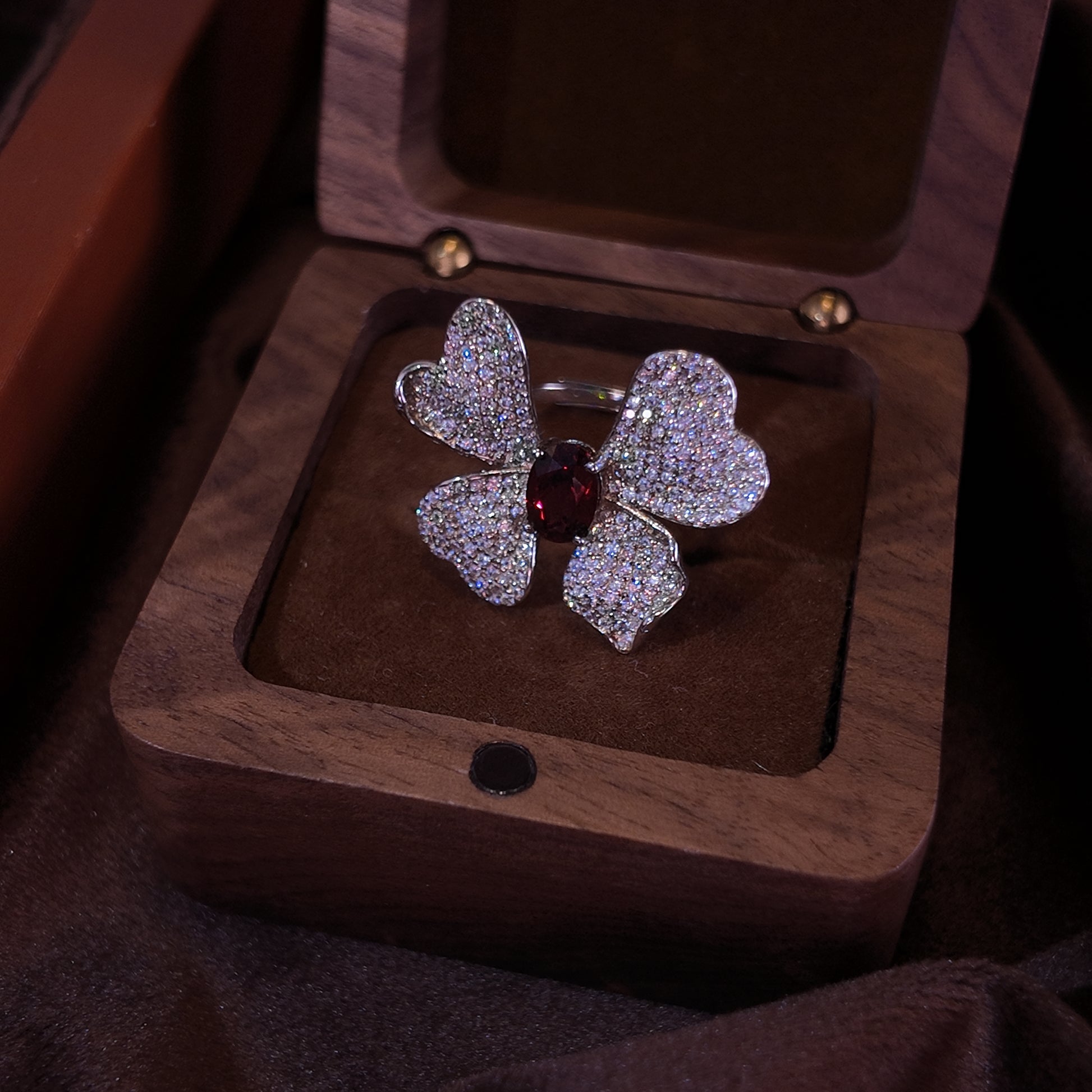 Natural Garnet Open Ring S925 Pure Silver Dark Red Three Dimensional Butterfly Inlaid Gemstone Palace Vintage