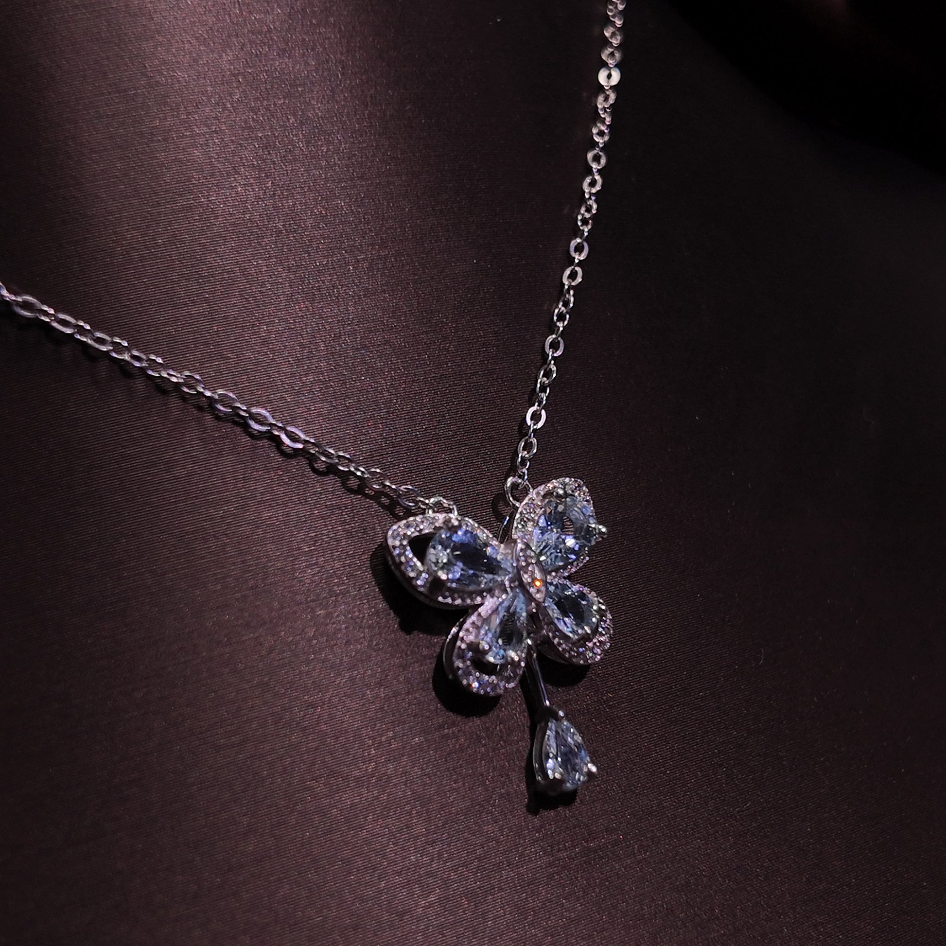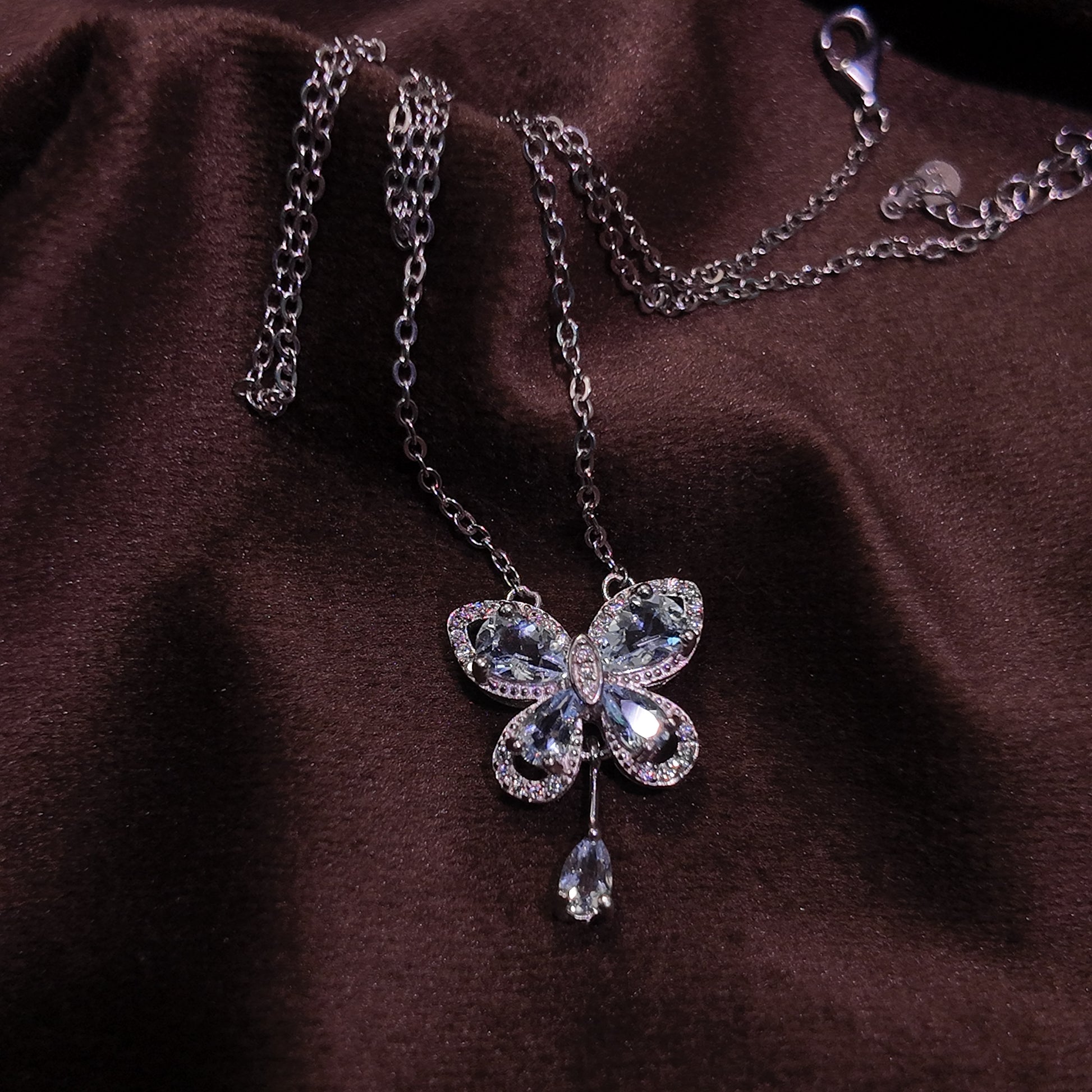Natural Sea Blue Treasure Necklace S925 Pure Silver Light Blue Butterfly Dynamic Pendant Palace Retro