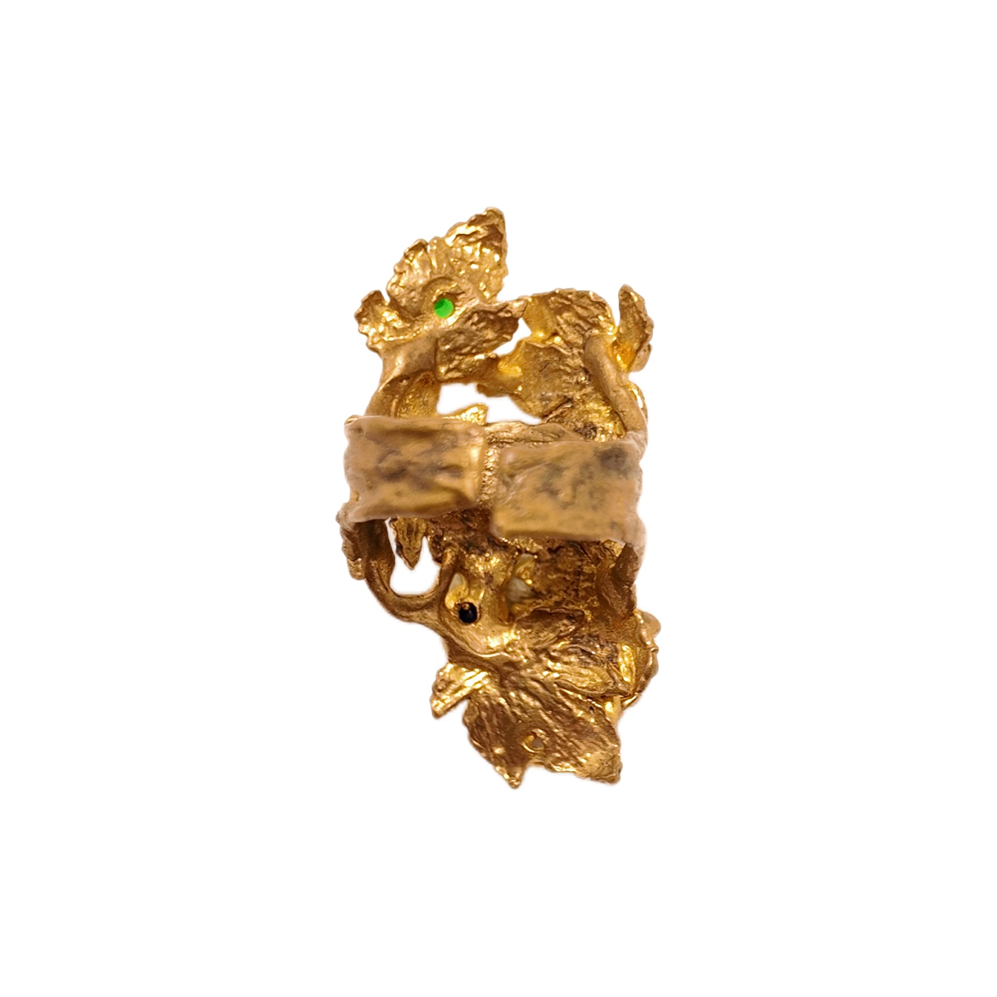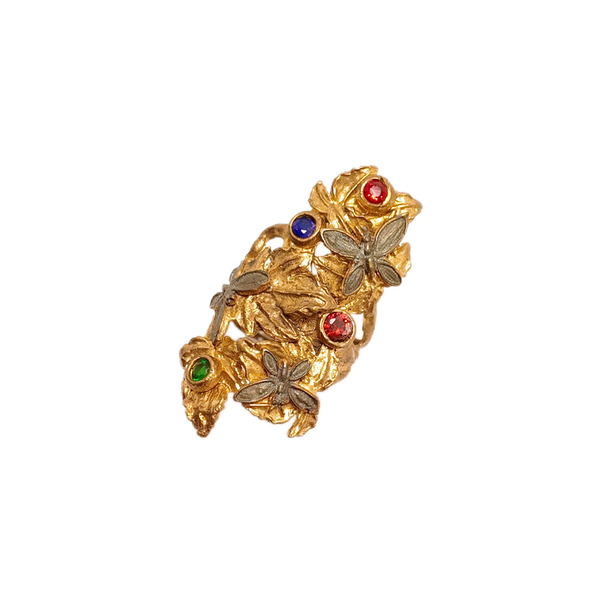 Vintage British 1950s brass ring with red blue green Rhinestone butterfly pattern court retro style