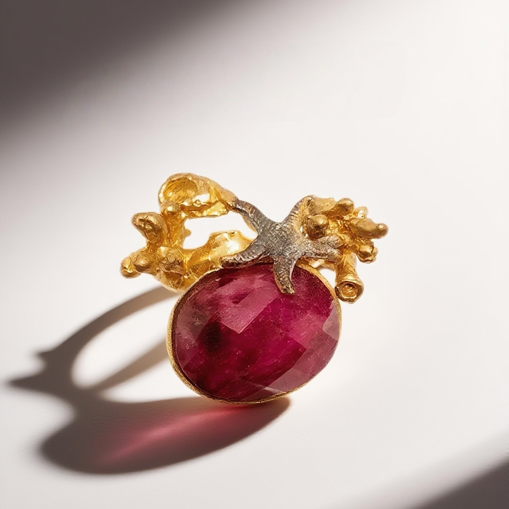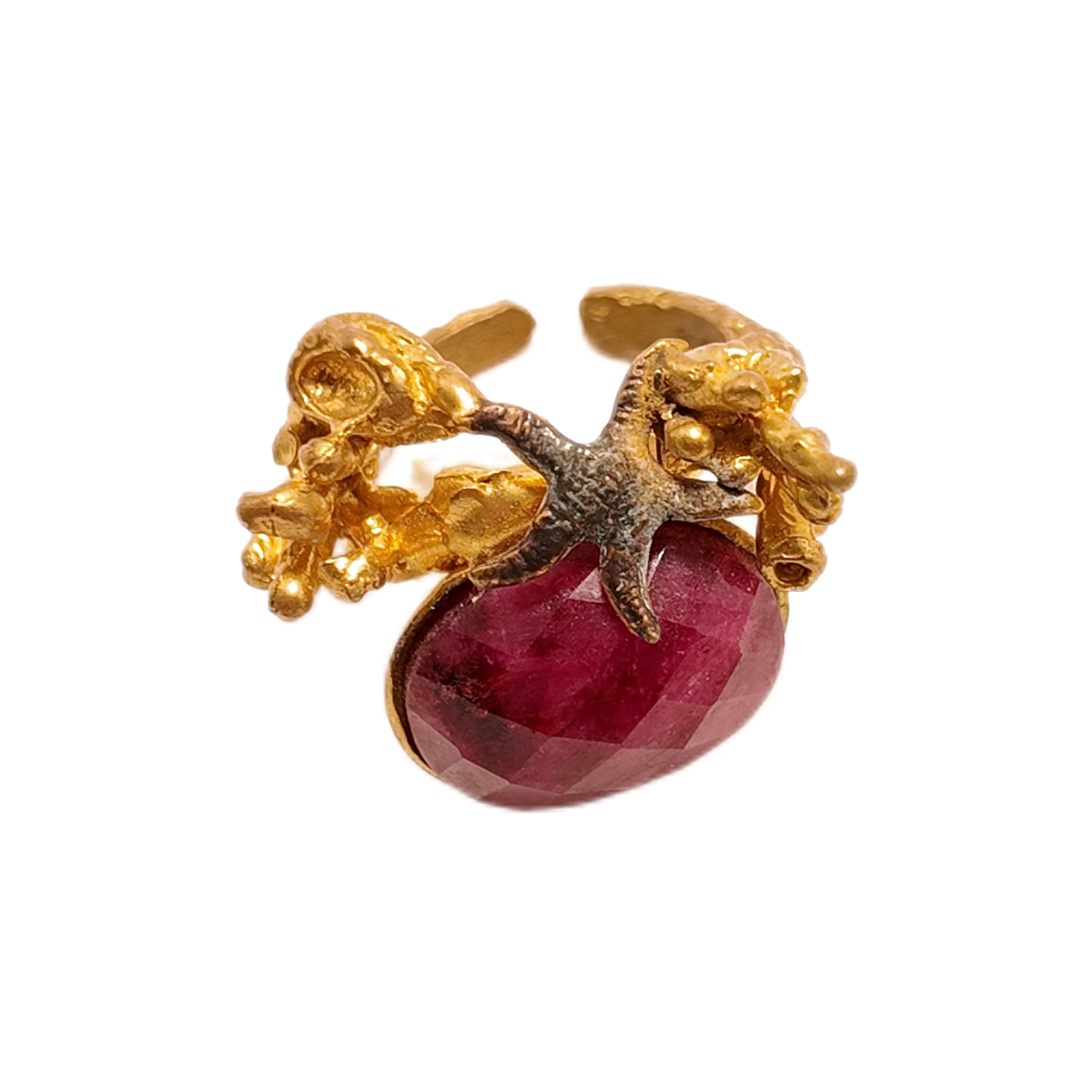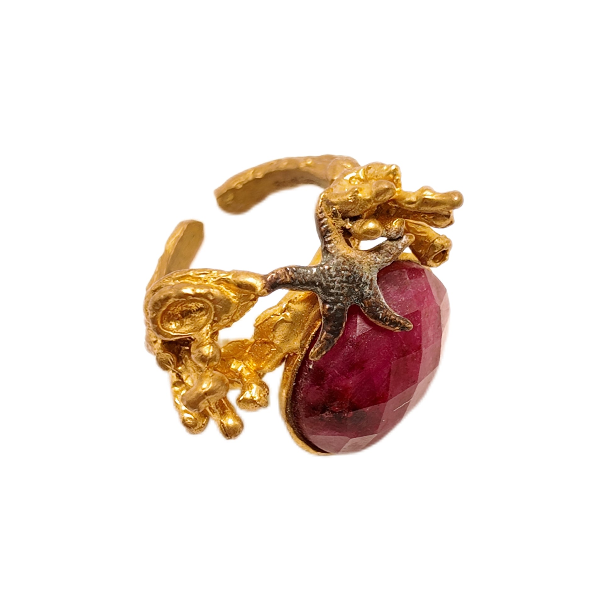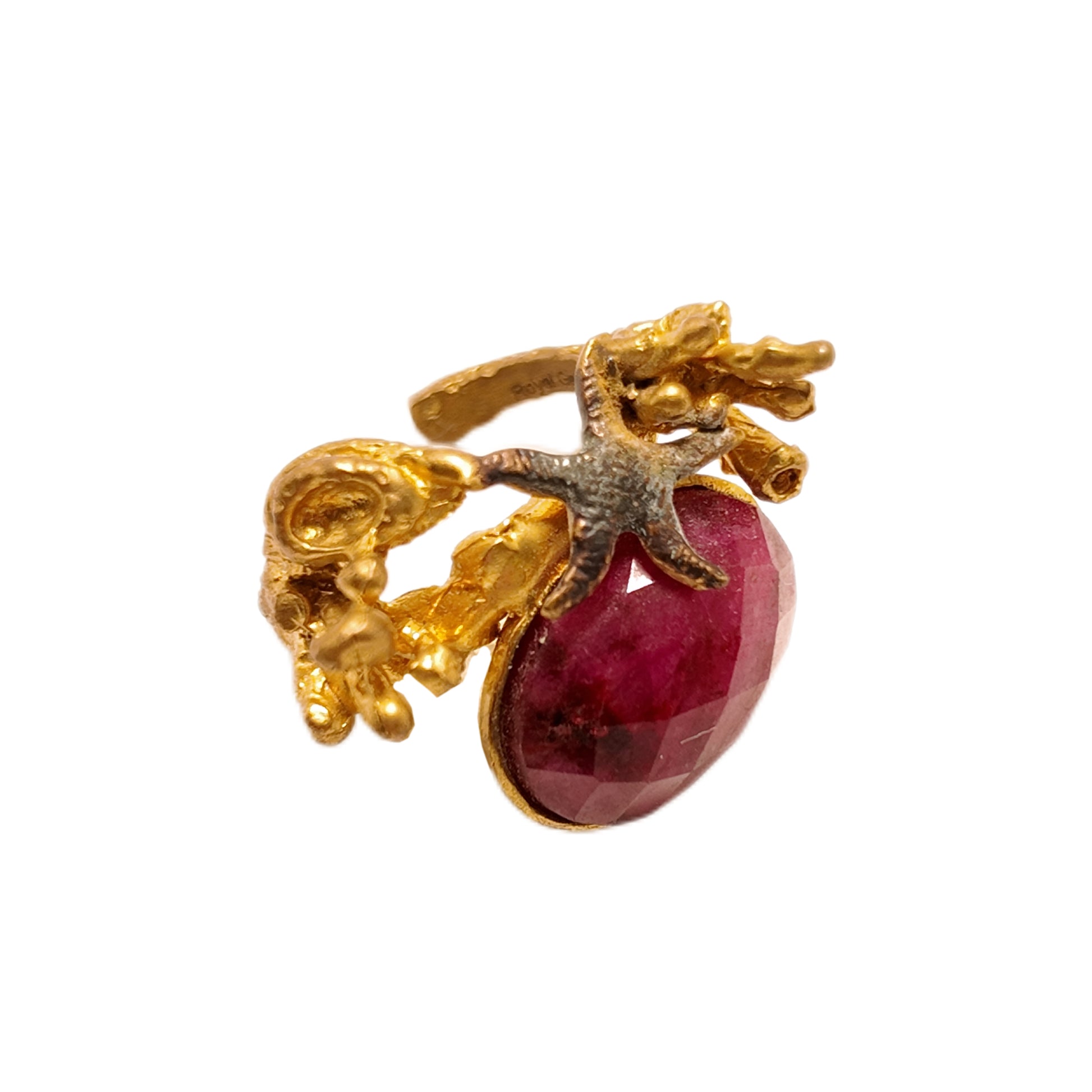 Vintage British 1960s natural stone brass ring three-dimensional underwater plant starfish court retro style