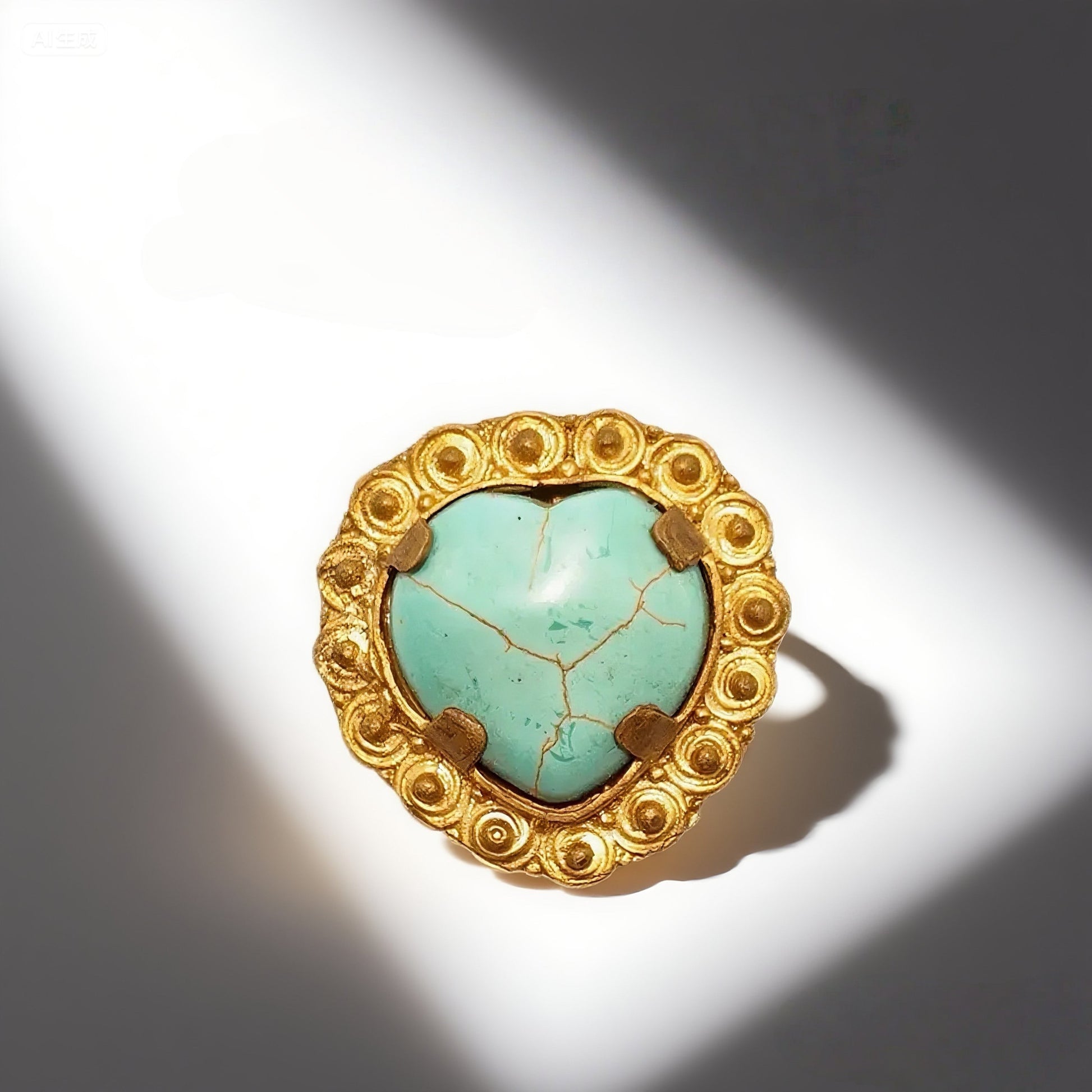 Vintage British 1960s natural turquoise brass ring with heart-shaped three-dimensional pattern court retro style