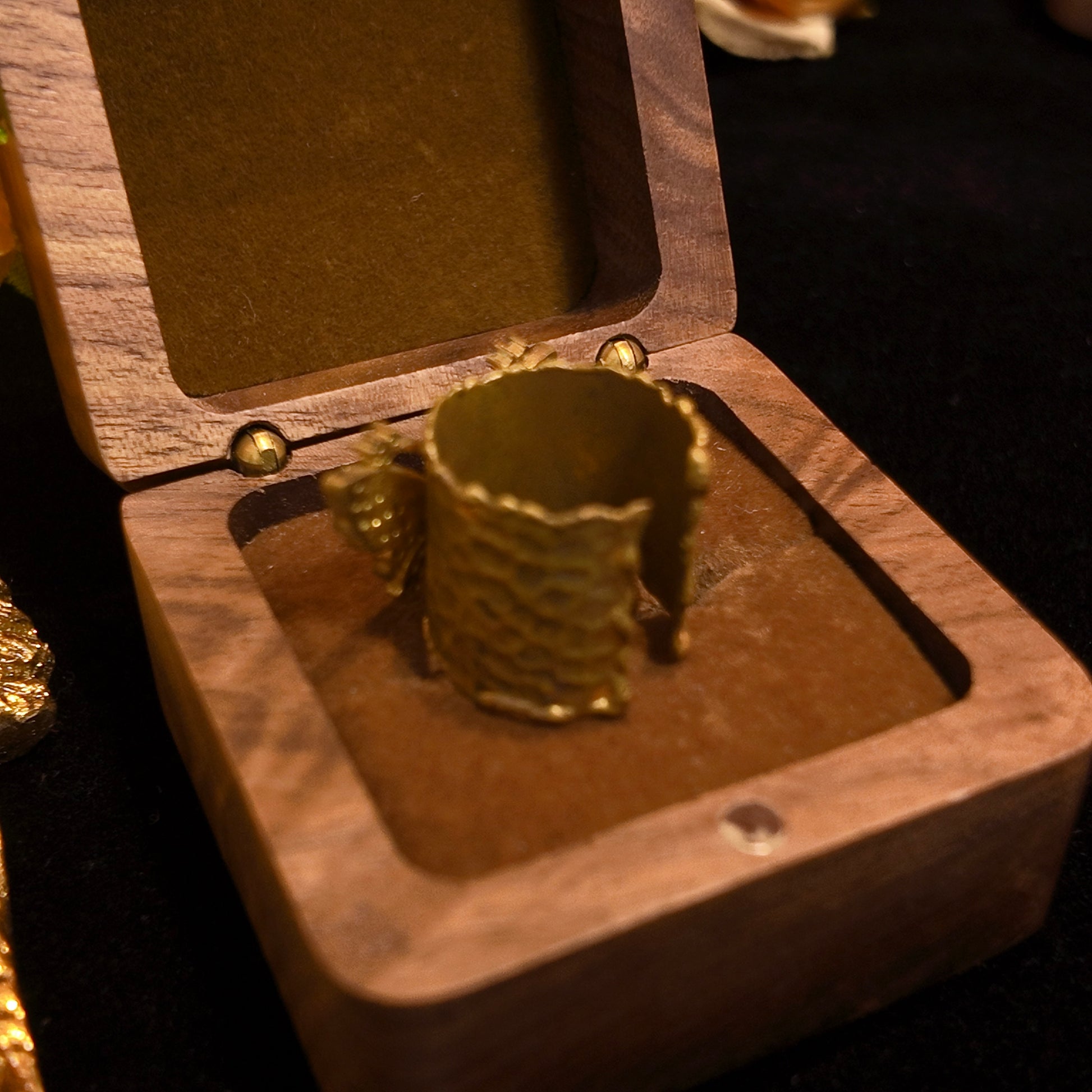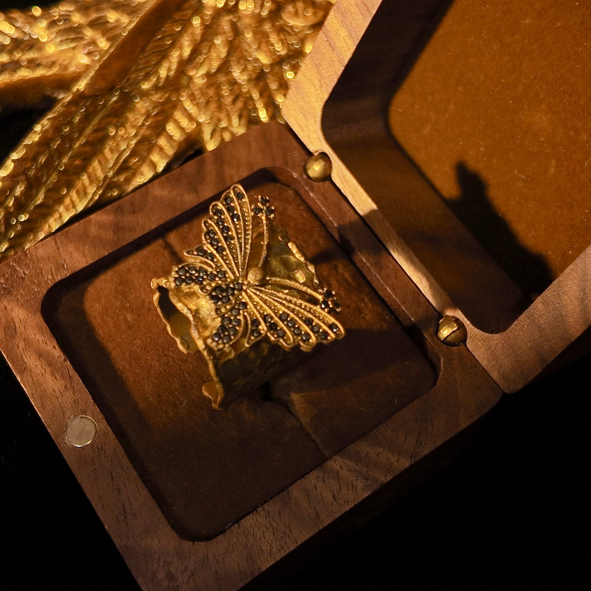 Vintage British 60 Year Rhinestone Brass Open Ring with Three Dimensional Butterfly and Diamond Set Palace Vintage Style