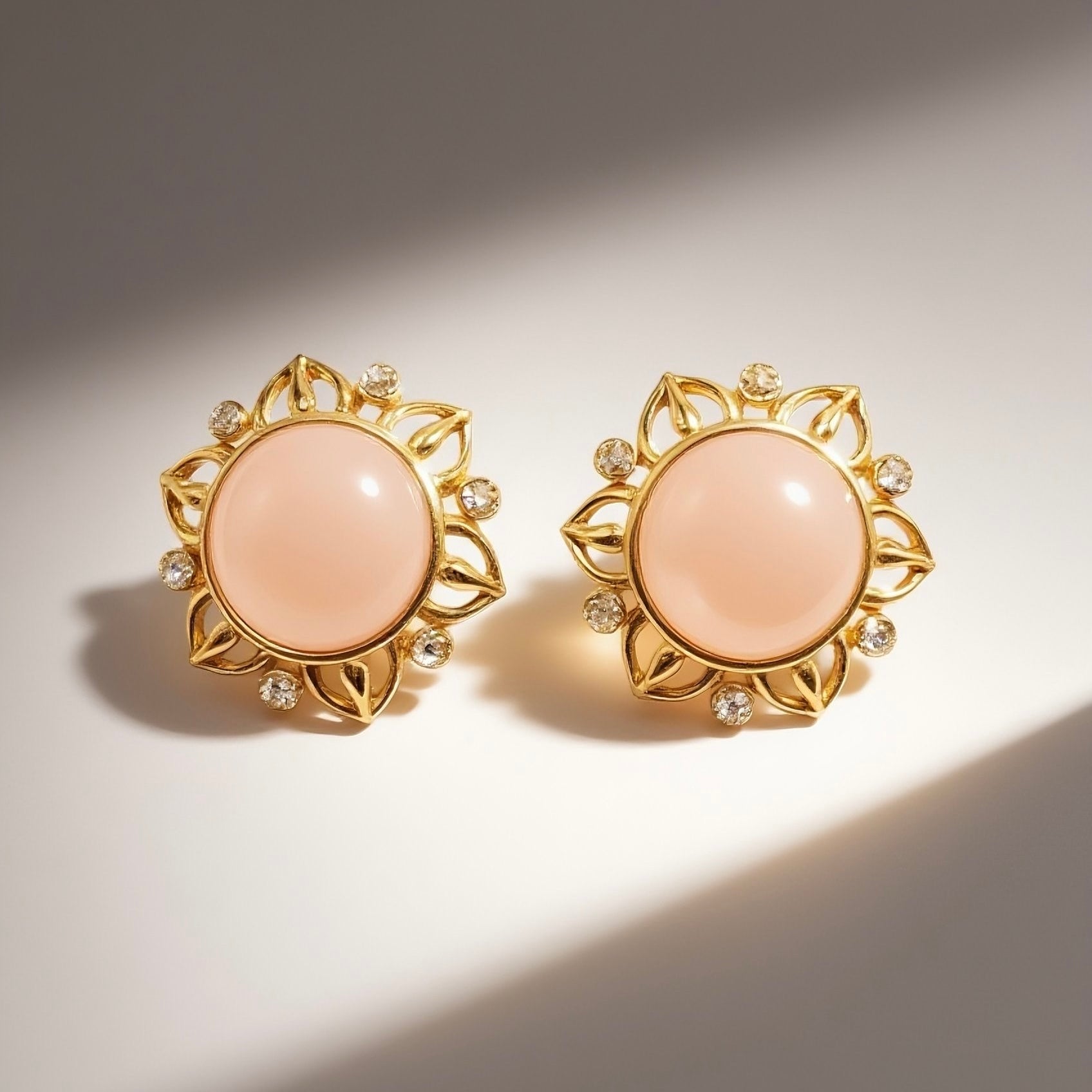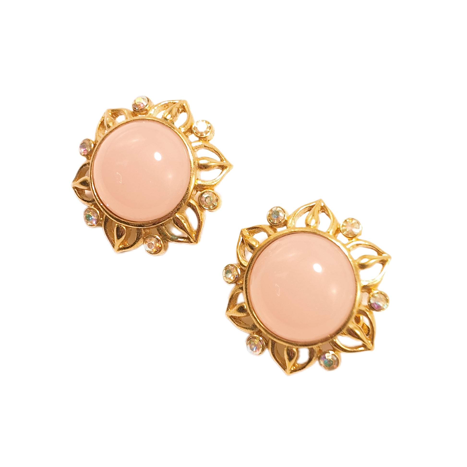 Vintage France 70s Sunflower shaped Rhinestone with Diamond Earclip Trifari Label Pink Glass Palace Vintage Style