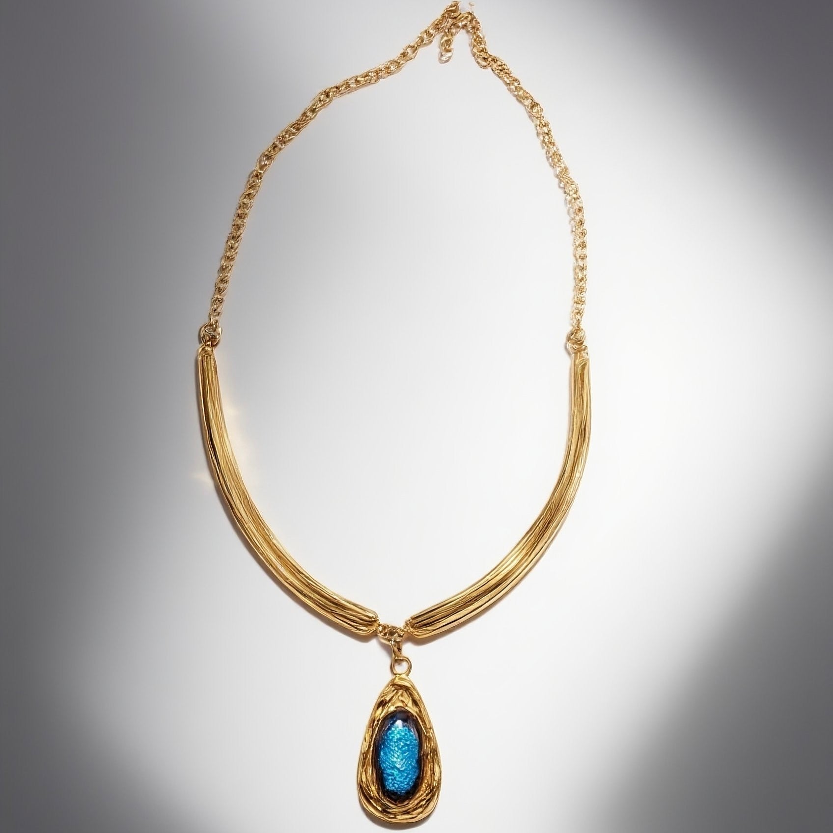 Vintage French 1960s blue necklace with oval shaped glass and unique design featuring a court retro style