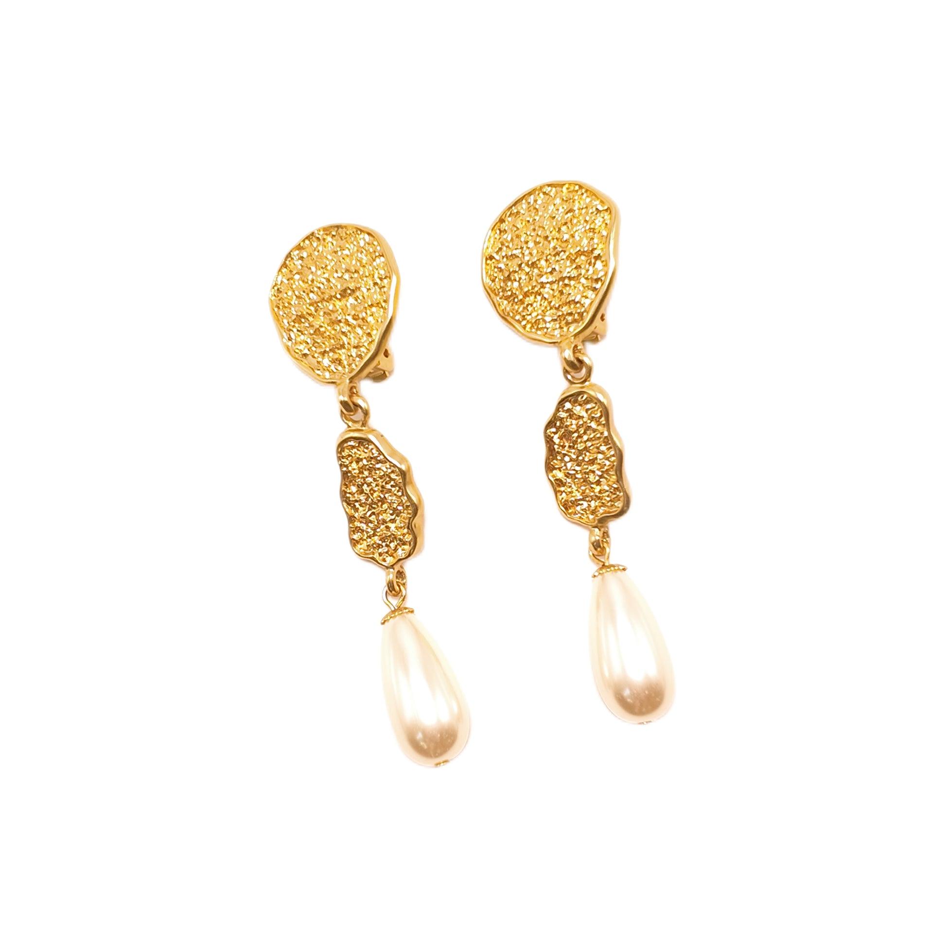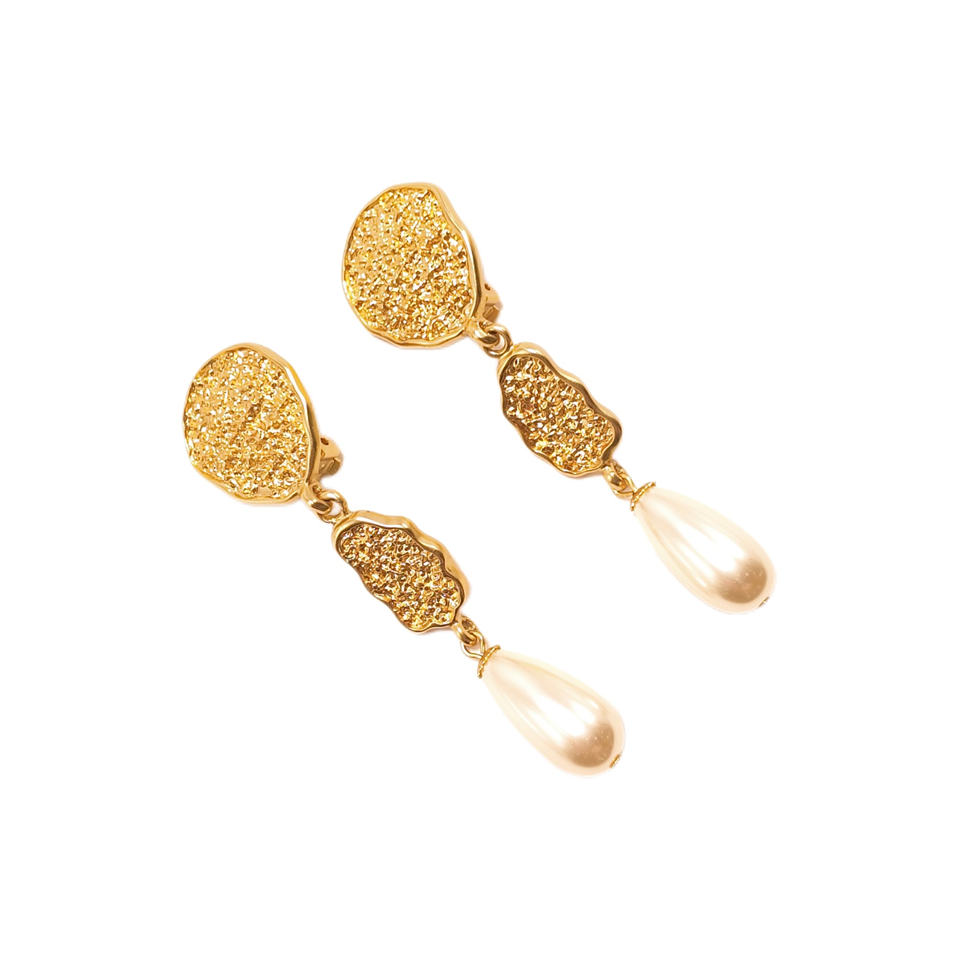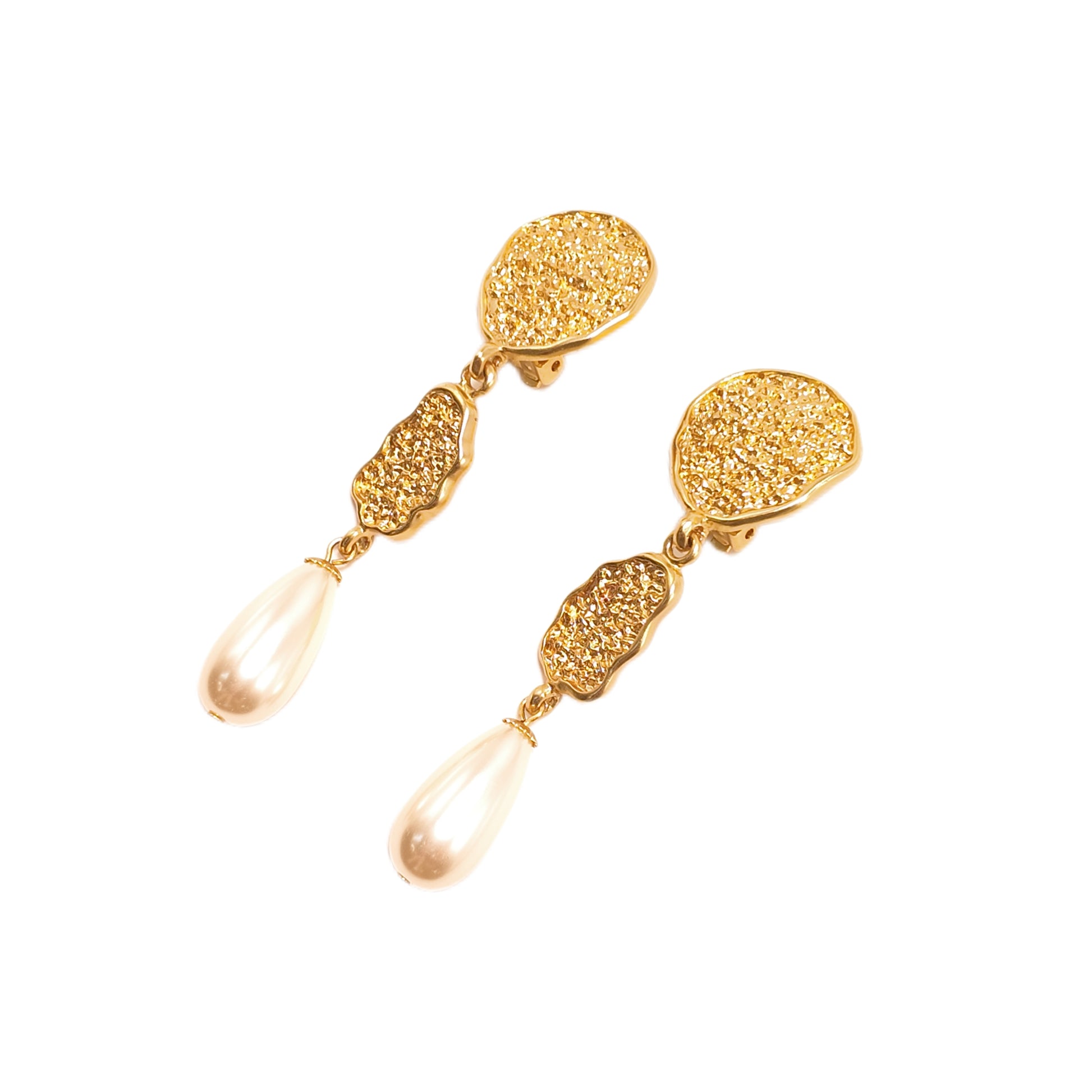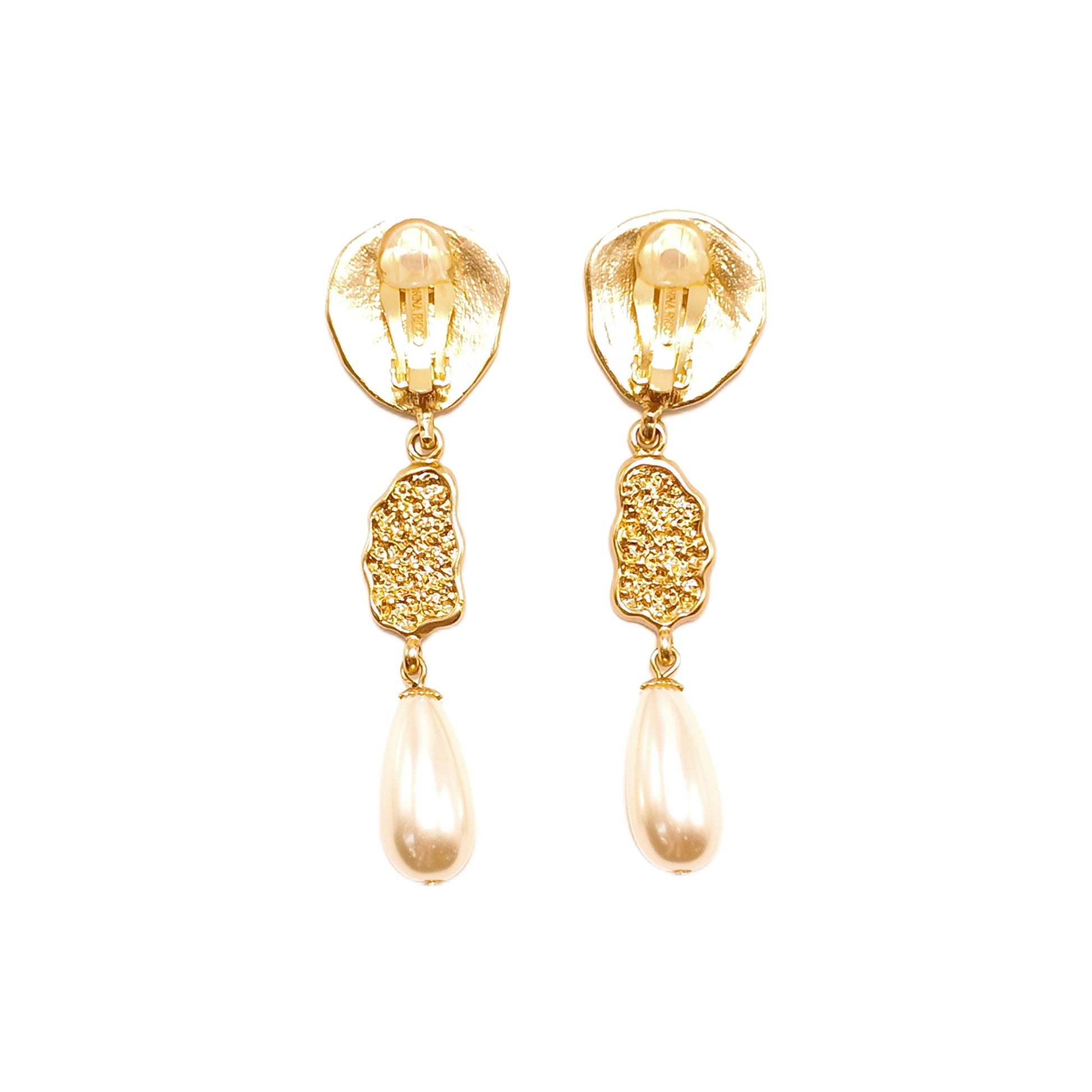 Vintage French 90s Nina Ricci three piece spliced ear clip white imitation pearl sweeping shoulder court retro style