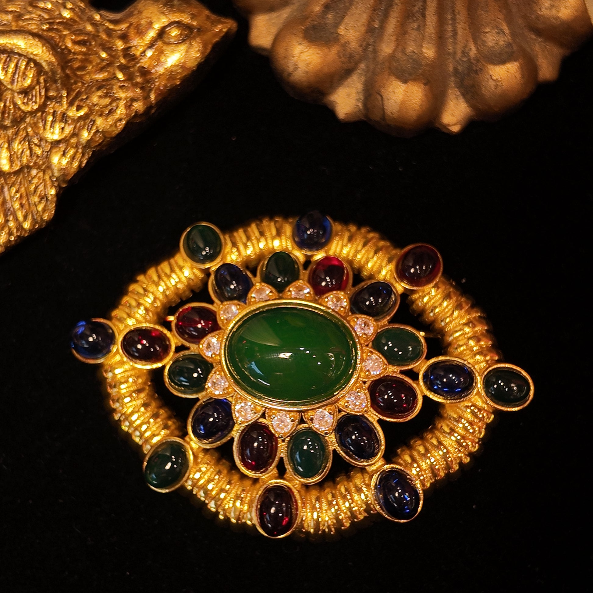 Vintage oval sunflower brooch red green blue glazed heavy industry palace retro style
