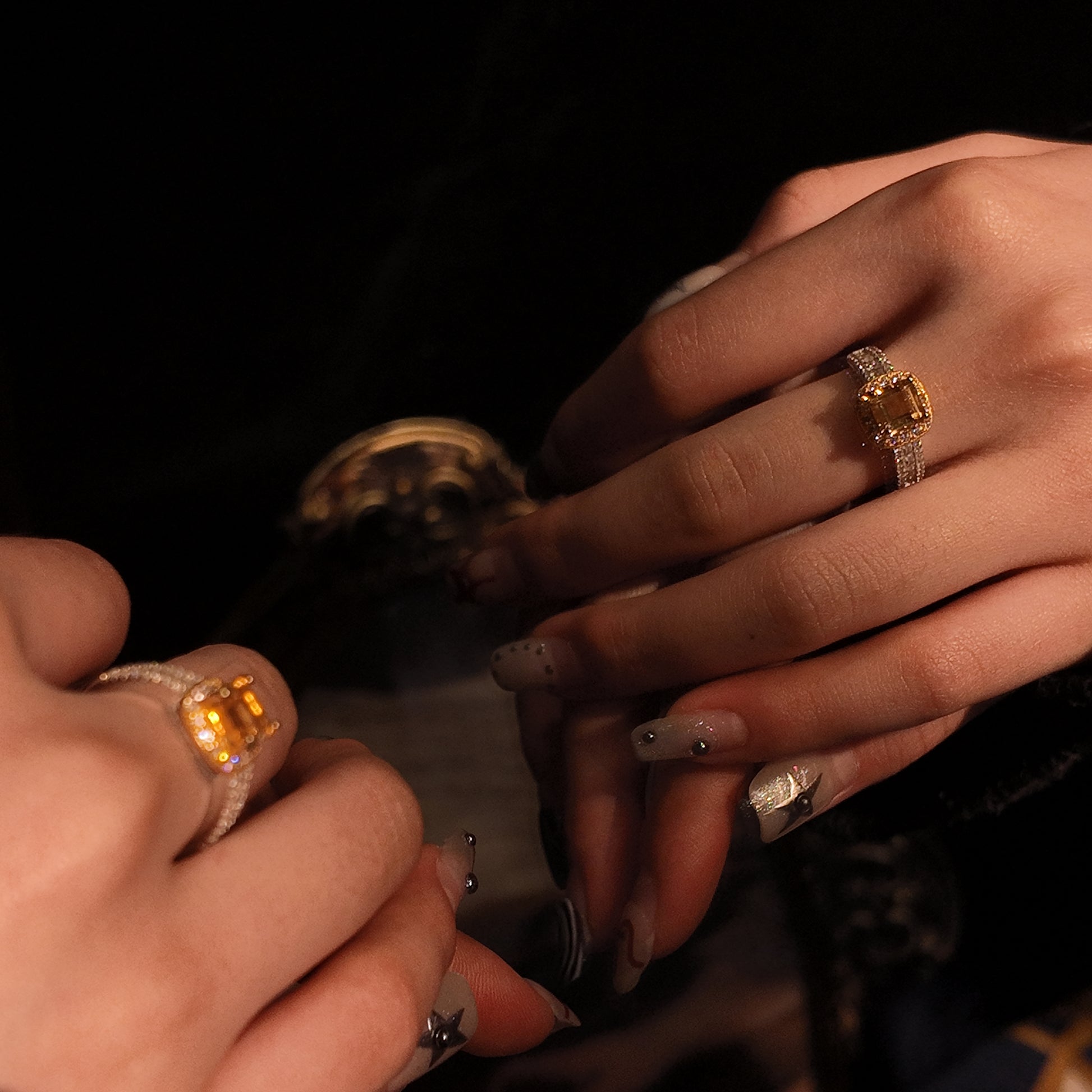 Yellow Crystal Open Ring S925 Pure Silver Yellow Square Inlaid with Palace Vintage